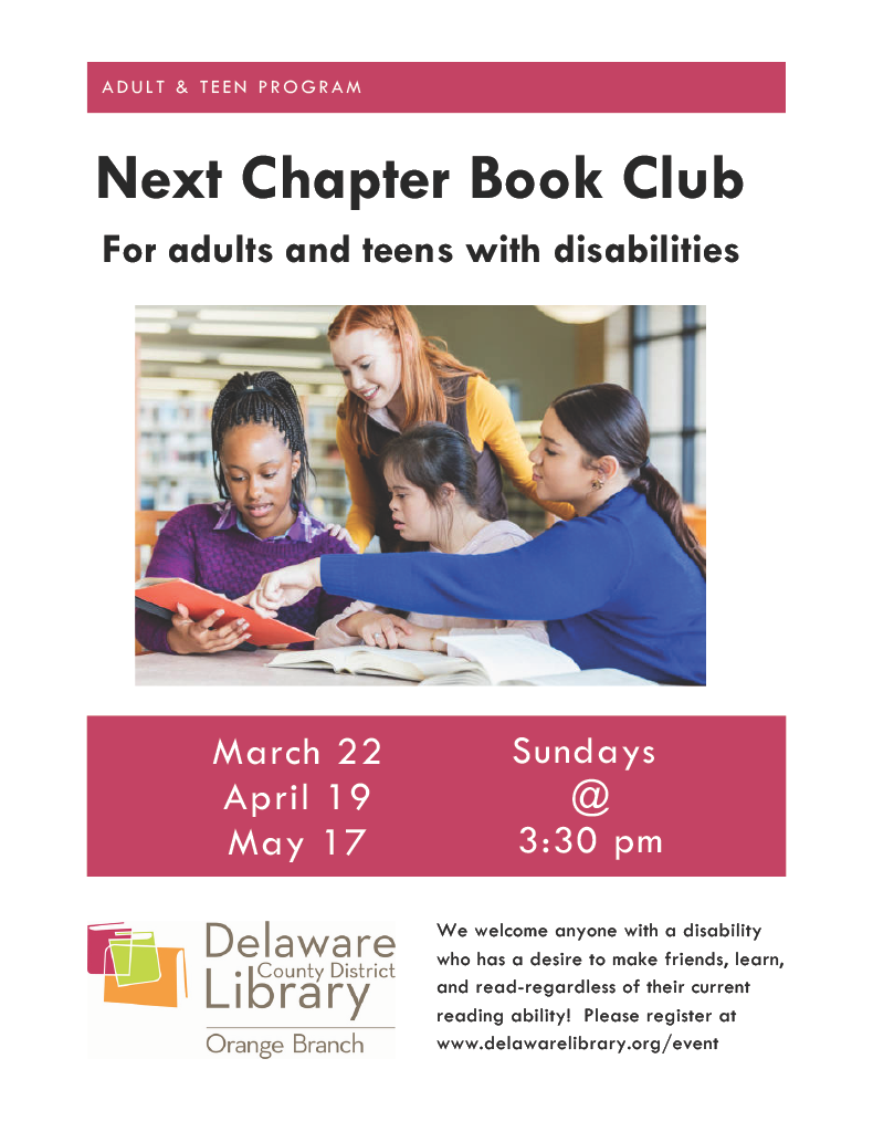 Make new friends and enjoy great stories at Next Chapter Book Club at the Orange Branch of the Delaware County Library. This adult and teen program welcomes individuals with disabilities who want to connect, learn, and have fun through reading. All abilities are encouraged to participate. Sign up for Next Chapter Book Club.